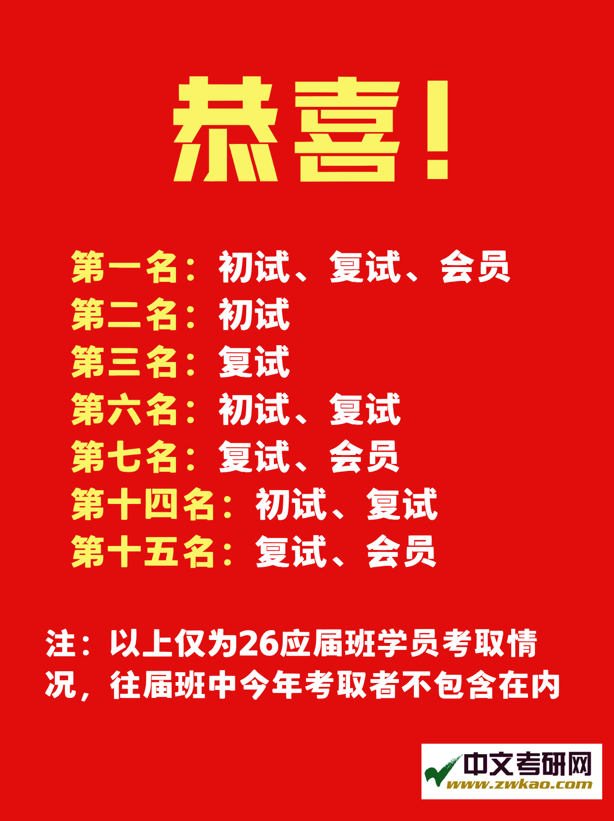 在这里我们要特别感谢各位学员对中文考研网的信任和大力支持!大家的成功100%完全来自于你们踏实的努力,是无数个日夜的灯光和汗水换来的结果,绝不是任何机构的功劳。如果大家觉得中文考研网的辅导起到了一点点辅助作用,我们感到很欣慰!在这里向你们表示衷心的祝贺!祝贺你们最终圆梦,走向人生道路上新的辉煌!