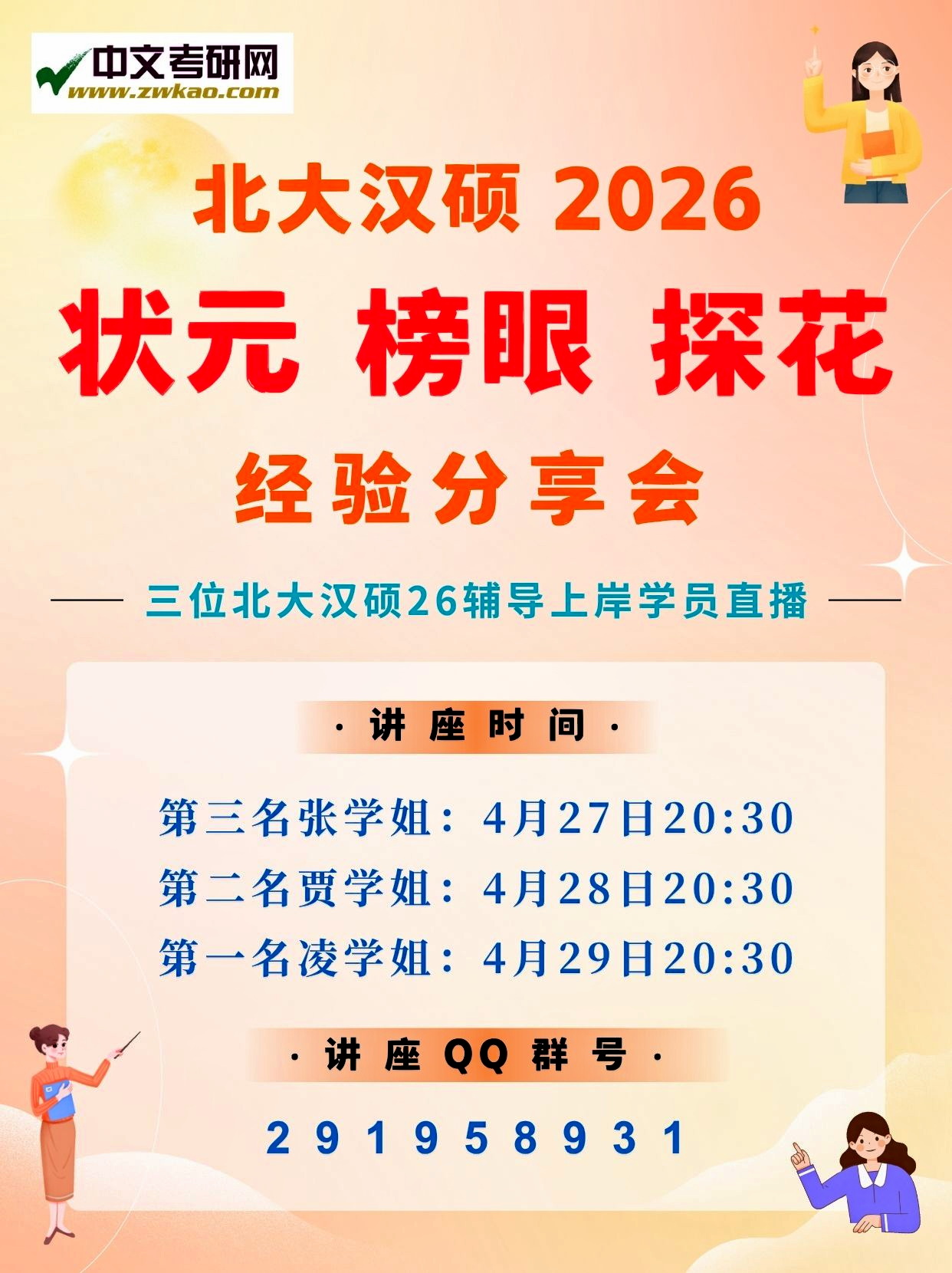大家好!今年的北大汉硕上岸学姐经验分享会定于4月27-29日每天20:30在线直播。我们请来了三位优秀的北大汉硕26辅导班学员——北大汉硕2026考研总排名第一名、第二名、第三名的三位学姐为大家分享她们的备考经验和心路历程,并现场解答大家的问题,欢迎准时收听!