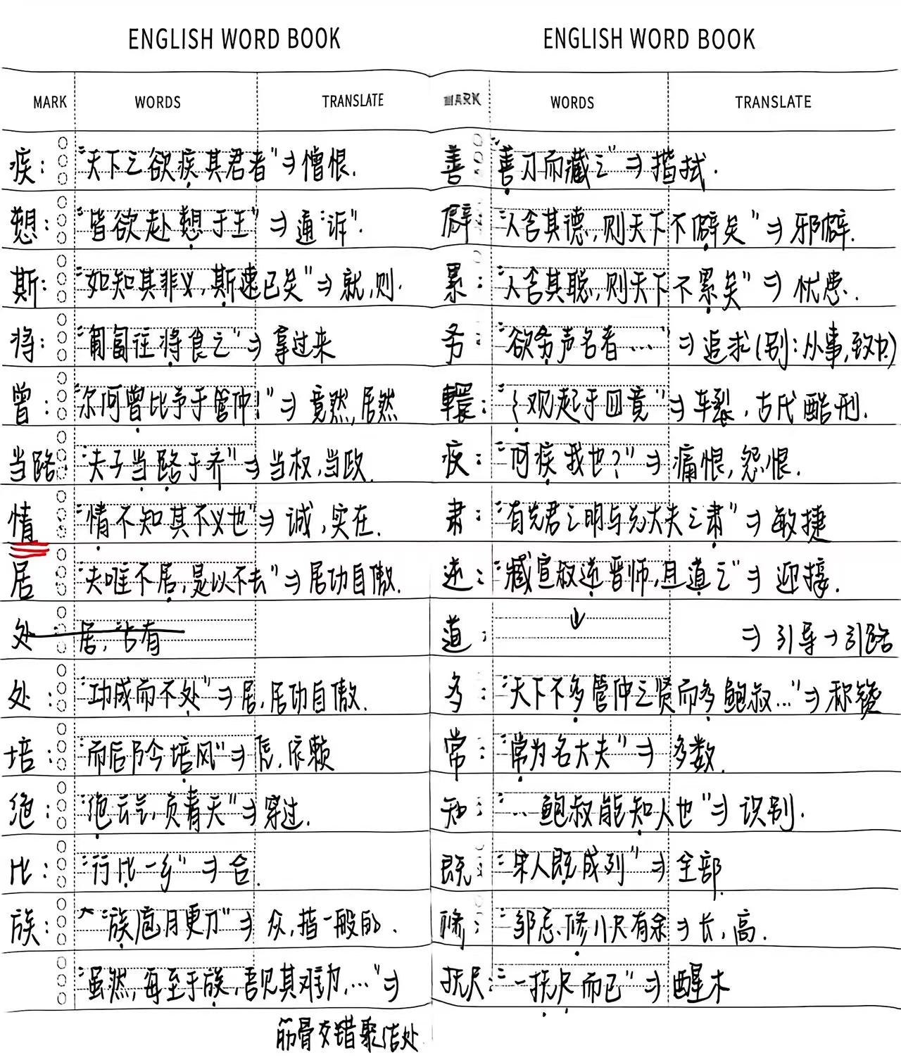 文选与语感:我备考古汉的核心策略是每天看几页文选,把培养语感放在第一位。参考书用的是王力的《古代汉语》,集中看前两册即可,这两册包含了古代汉语最核心的文选、常用字词、句式和通论知识。每天只需要花半小时到一小时,不用贪多,关键在于坚持。推荐下面的这本《手写笔记》,里面是王力版的一些补充,易于新手上手。看文选的时候,我会先自己试着翻译一遍,再对照注释检验,重点关注那些高频出现的实词、虚词和特殊句式。
