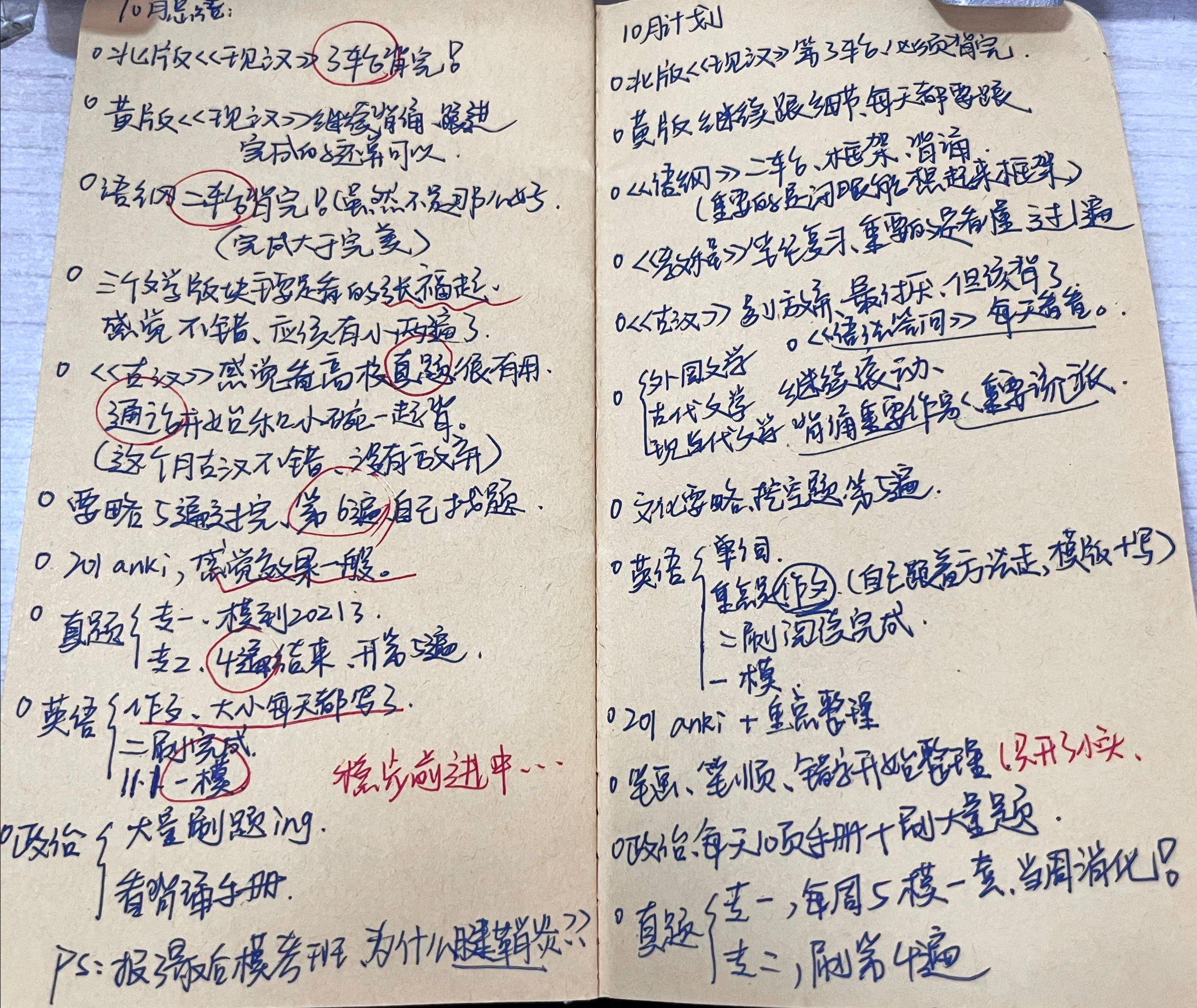 ps:真题我后面会单独开一段讲的,大家看自己的情况开就好,当然我建议早点研究真题,尤其是近三年的,越早越好。下面这张是我的10月计划和总结,只是给大家作为参考,我那时候每个月明确知道自己想做什么怎么做,每一条也基本是完成的。