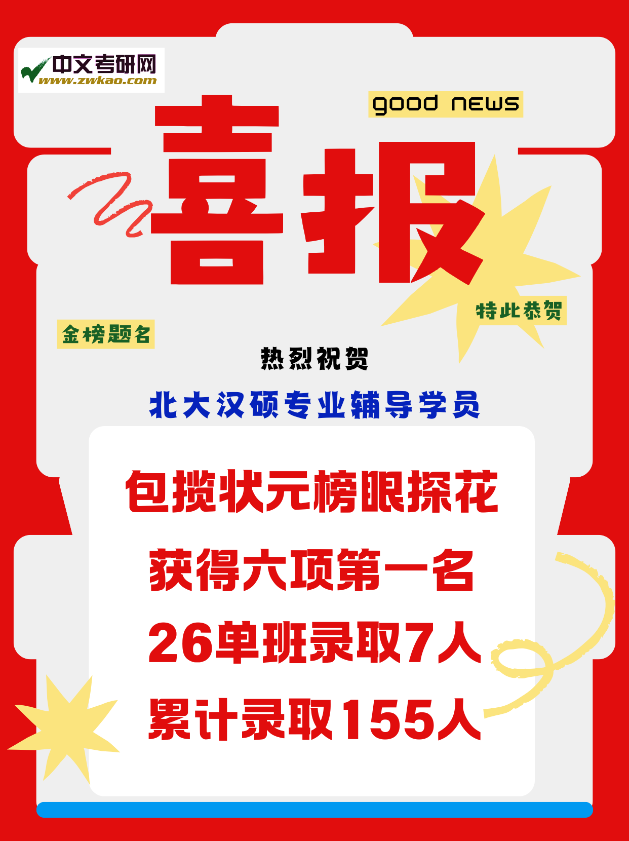 北京大学国际中文教育2026年拟录取工作已告一段落,中文考研网北大汉硕2026专业辅导学员包揽状元、榜眼、探花!获得六项第一名:最终总排名第一名、初试总分第一名、复试成绩第一名(2人)、初试专业课总分第一名、初试专业一第一名、初试专业二第一名!