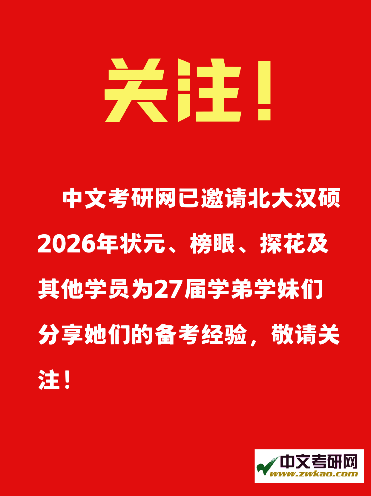 中文考研网已邀请北大汉硕2026年状元、榜眼、探花及其他学员为27届学弟学妹们分享她们的备考经验,敬请关注!
